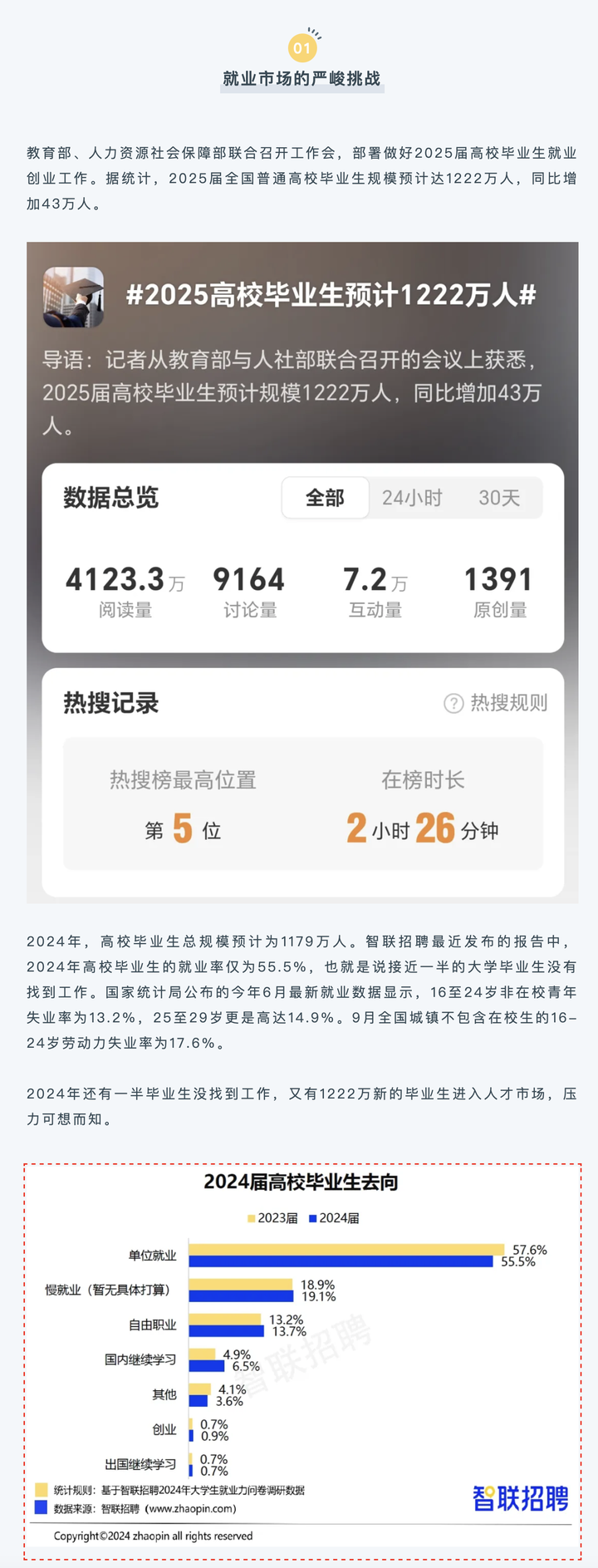 意味着2024年还有一半毕业生没找到工作,又有1222万新的毕业生进入人才市场,应届生的压力可想而知。