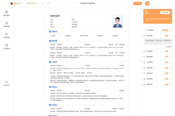 以上就是今天的内容分享,如果不知道怎么写简历,>> 点击这里,可以使用100分简历,为求职者提升面试邀约率而开发,平台提供标准化简历模板,简历编辑区域还集成了Deepseek进行简历优化分析。