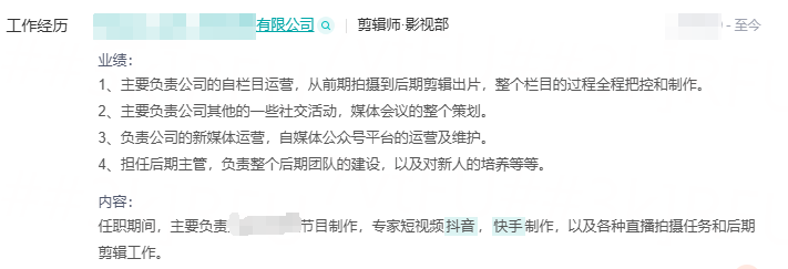 解答:上述简历内容属于无效工作经历,项目经历内容如果类似,一样是无效内容。因为HR不能够肯定候选人是否真的在职该公司参与剪辑工作,也可能是包装的工作经历。通过工作经历HR看不到候选人的每天工作量及工作转化结果。