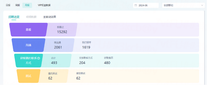 上述图片内容,是一位BOSS直聘最佳面试官2024年06月份的单月简历招聘的部分数据。