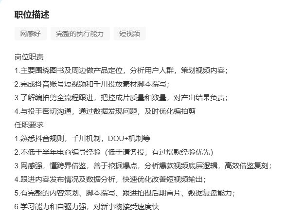 招聘关键词:图书、抖音短视频、千川、脚本、全流程跟进等。