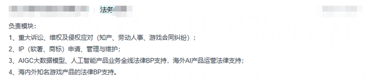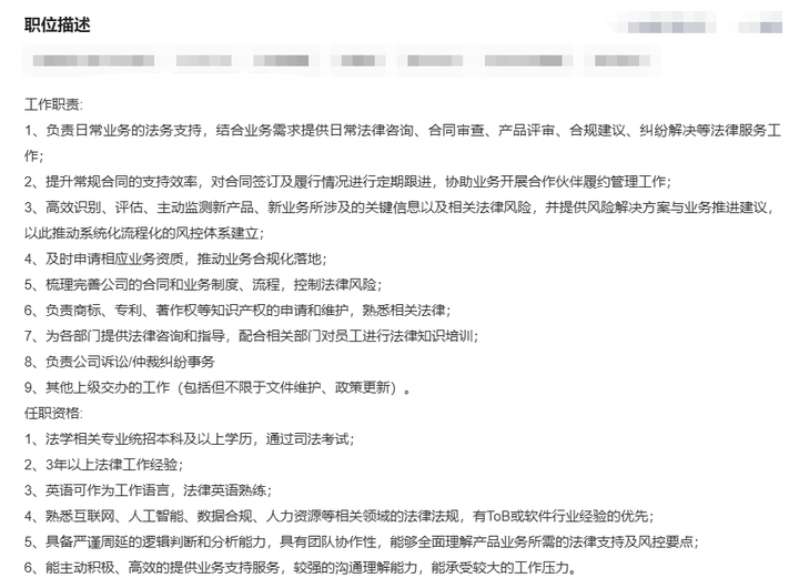招聘关键词:合规、纠纷、诉讼、商标专利、法律培训、风险管理、人工智能等ToB软件行业等。