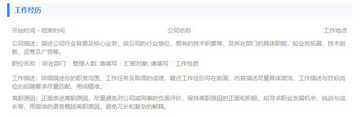 在分享一个小妙招,在工作经历中可以描述部门名称、汇报职务等信息,会增加HR对于简历工作经历内容的上下文联系。 >>点击这里,为大家提供了下方图片的标准化模板(PC端编辑更方便哦)