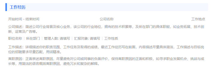 什么是好的上下文内容,在上述图片工作经历中增加了:公司描述、所在部门、管理人数、汇报对象、离职原因等信息,通过上述内容信息,使得在HR阅读工作描述之外,能够迅速且全面的掌握候选人在公司中的岗位定位和实际的工作内容及成果,大大的提高了候选人的受邀约面试机会。