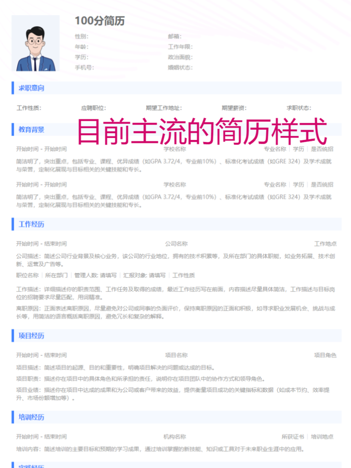 目前主流的简历模板、整体样式简约、信息描述清晰。>>点击这里获取更多标准化简历模板,包括上方图片的简历样式(PC端编辑更方便哦)